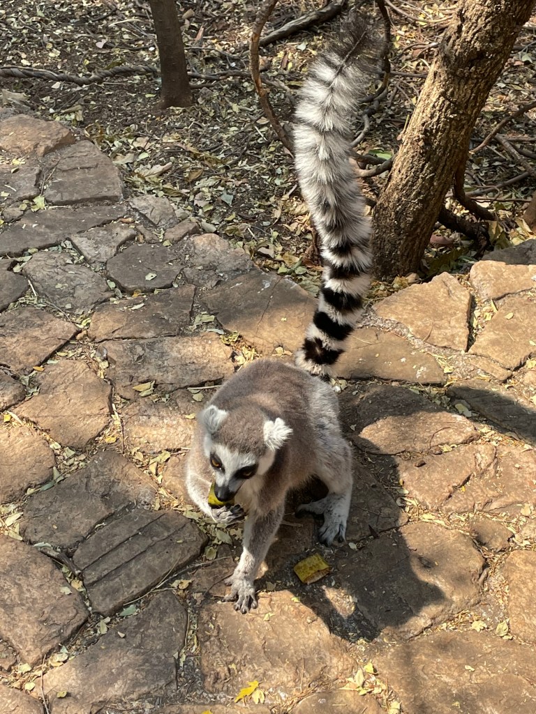 During our recent mini break to Magaliesberg Mountains, we visited the Bush Babies Monkey Sanctuary. It was a wonderful visit. The monkeys have a very large enclosure to roam and are safe and well fed. They have all sorts of small monkeys and lemurs which are very brazen and come right up to you. One was so enthusiastic he wee’d on my head. My family thought it was hilarious.