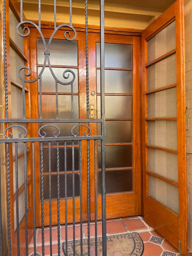 Original front door with sectionalised glass panels. The two fly screens against the walls are also original.