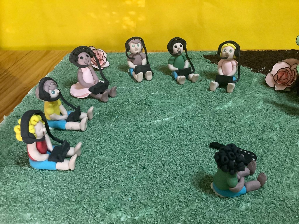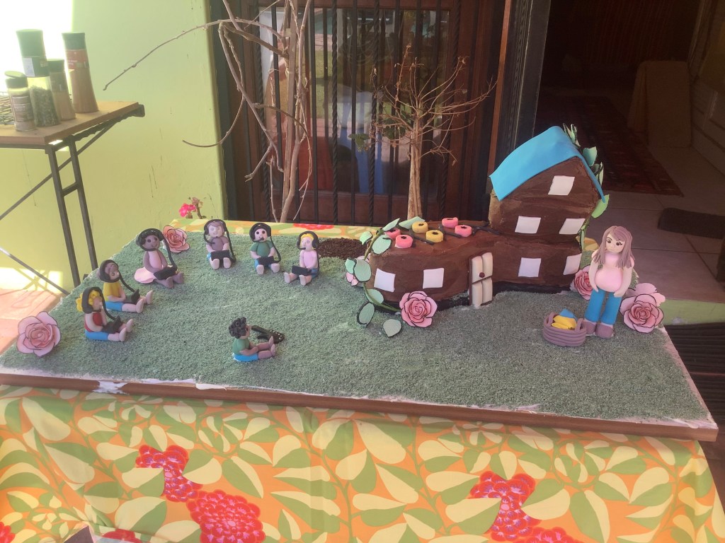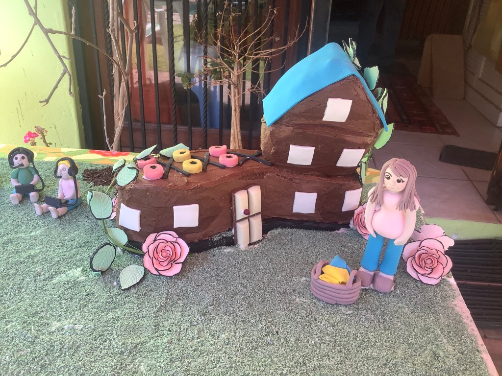 This next cake is not a Christmas theme, but it is fun and it has a door. It was a modern version of the old woman who lived in a shoe during lockdown with her children home schooling. Notice that mom has a lot of washing to hang out.