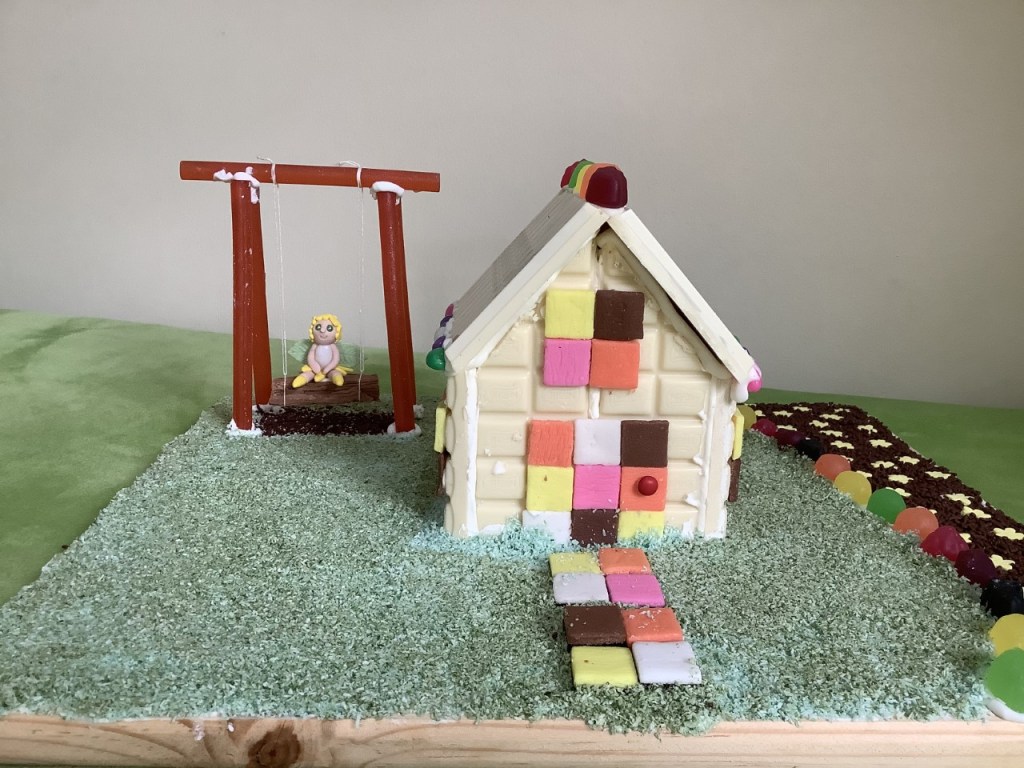 White chocolate house with a jelly bean fairy on a swing [that swing was a real challenge to make]