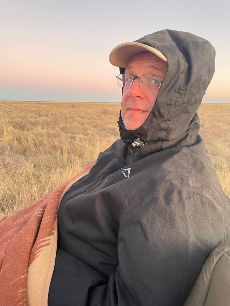 The second night of our stay at Tau, the temperatures dropped significantly overnight. It was really cold when we left for our early morning drive at 5.30am. The game ranger game us heat packs for our laps and hands as well as blankets. Here we are wrapped up in our winter woolies: