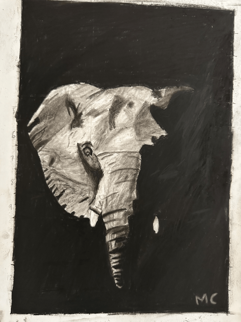 Picture caption: Michael’s charcoal elephant. I think I influence his art – haha!