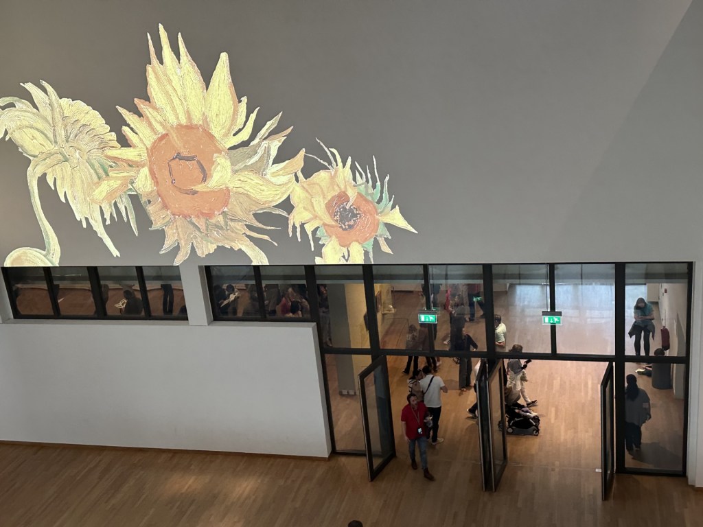 Picture captions: Inside doors at the van Gogh Museum with interactive light show paintings