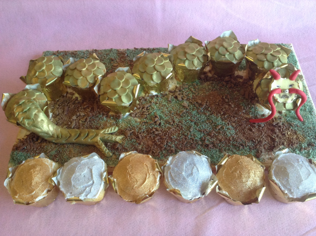 Picture caption: This was my first attempt at a Chinese Dragon cake. I made this for one of Michael’s birthdays. The scales are gold and I added edible gold glitter.