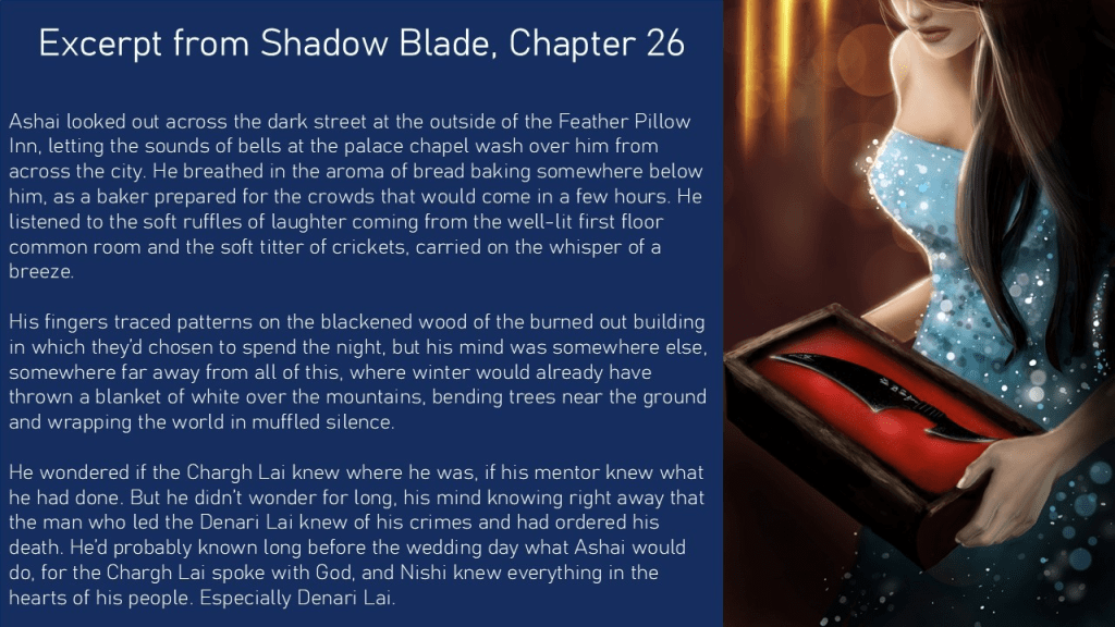 Welcome to Day 4 of the WordCrafter Shadow Blade Book Blog Tour. We want to thank Robbie Cheadle at Roberta Writes for hosting this stop and helping to support the re-release of this wonderful fantasy adventure. First released through WordFire Press, WordCrafter Press is proud to release this second edition with a free original prequel book from the same Denari Lai series, Baiting the Hook, never before published, in the back matter when you buy the book. And on this stop , we have for you an excerpt from Baiting the Hook, read by the talented Jeff Bowels.