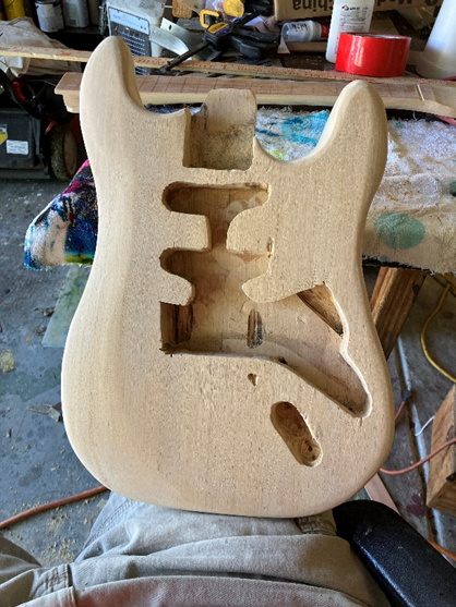 These were all pretty crude instruments and played, but were not that great of a sound. A few weeks ago I decided to try making a solid body electric guitar. Using some wide 12-inch bed boards from the Habitat Restore, I was able to cut out one board with my jigsaw that had holes for the preloaded pick up from Amazon. Then I cut out a second piece exactly the same without the holes and glued the two together.