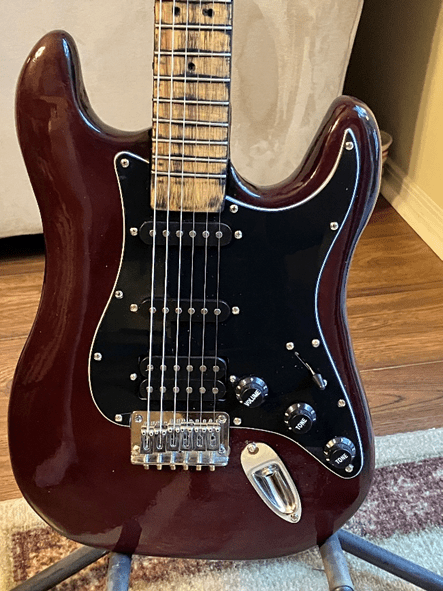 Using my table saw blade, I was able to carve and shape the body like many electric guitars. With the belt sander I sanded out the rough saw cuts and get it smooth. I made a neck out of the same wood and painted it with rust-oleum spray paint and some left over pearl red from my truck painting. I coated that with a can of 2K eurethane clear. It came out amazingly well.