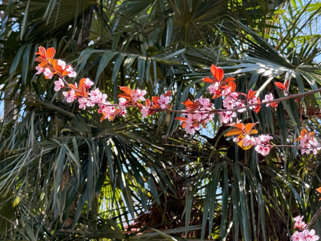 That cactus looks like a furry creature with paws. The pink blossom spray in front of the palm fronds is beautiful. I’m sure you are ready to welcome spring!