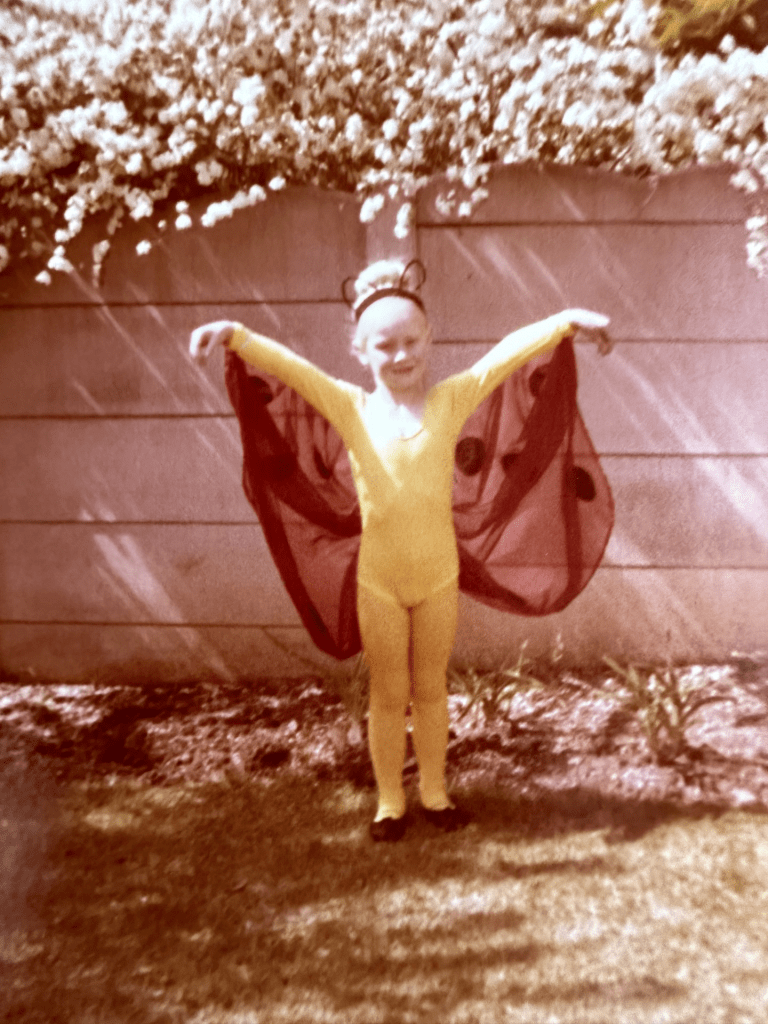 On the day of the concert, I was dressed in a yellow leotard, yellow tights, black ballet shoes, and a black Alice band with black sequinned antenna. I also had wings made from soft black netting with red dots on it.
