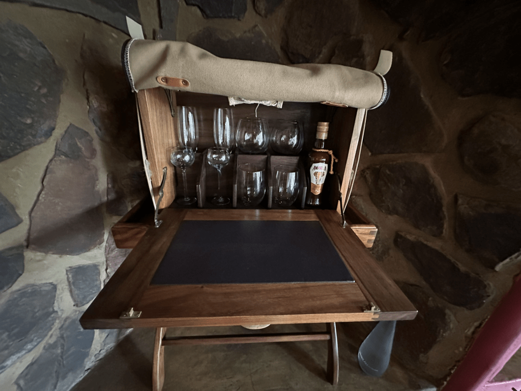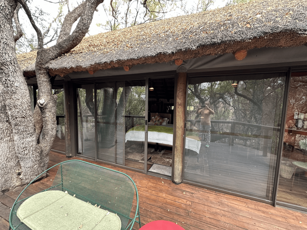 Picture caption: doors into our treehouse. You can see me in the reflection.Picture caption: Door into our camping drinks cabinet in the roomPicture caption: View of our tree housePicture caption: TC and I. I am wearing my new multi coloured mini multi focal glasses.