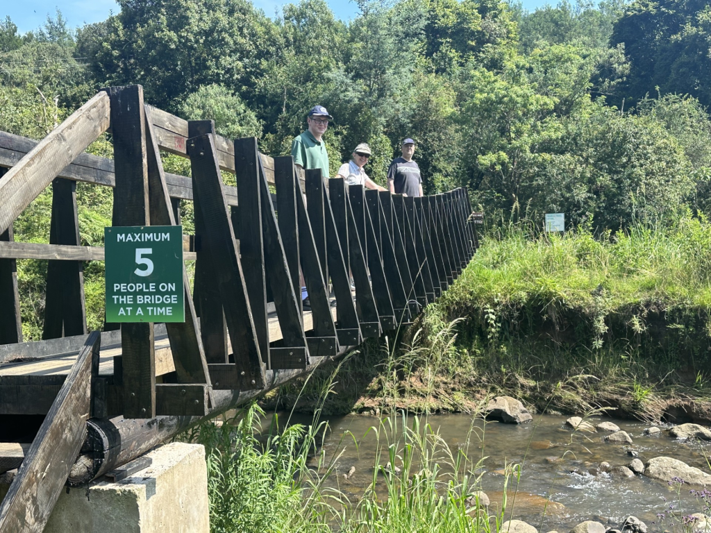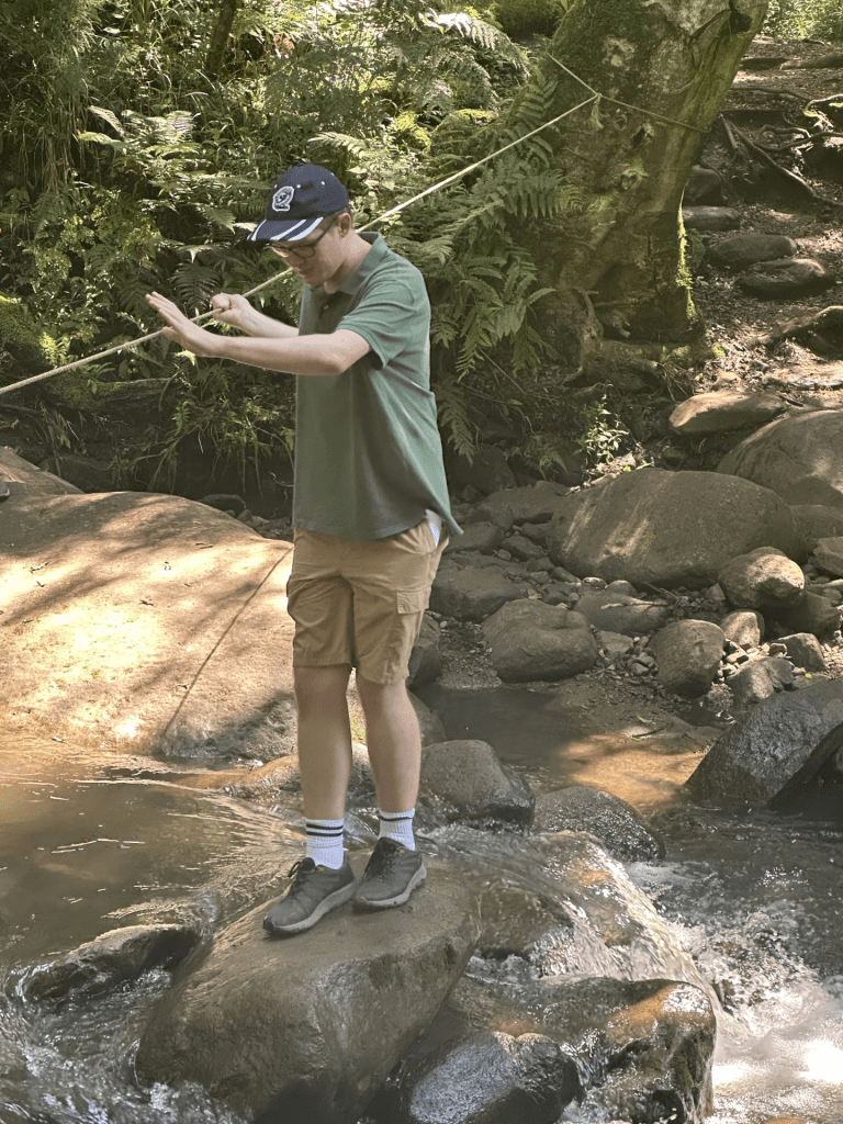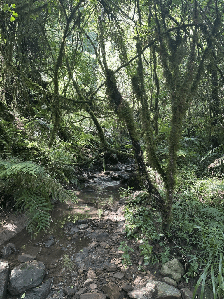 Picture caption: Crossing the bridge at the beginning of the trail from Drakensberg Sun HotelPicture caption: Trail in the Drakensberg Mountains, South AfricaPicture caption: Gregory crossing the swollen river using a rope. I was already across ready to help the others. I am a mountain goat – haha!